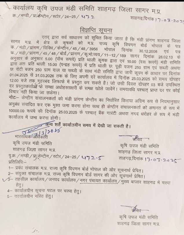 किसानों को 5 रुपए भोजन देने टेंडर प्रक्रिया 25 तक ।  चार साल से एक भी किसान ने किया पांच रूपए में भोजन ।       शाहगढ़। कृषि उपज मंडी में अपनी फसल बेचने आने वाले हर...